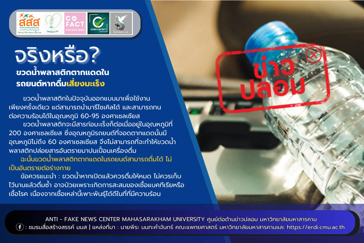 จากการสัมภาษณ์ นายพีระ นนทะคำจันทร์ นักวิชาการวิจัยและนวัตกรรม โรงพยาบาลสุทธาเวช คณะแพทยศาสตร์ มหาวิทยาลัยมหาสารคาม กล่าวว่า “ขวดน้ำดื่มหรือขวดน้ำพลาสติกทนทานต่อความร้อนได้ถึง 60-95 องศาเซลเซียส การที่จะก่อให้เกิดสารก่อมะเร็งได้ ต้องเกิดจากความร้อนที่มากกว่า 200 องศาเซลเซียส รถยนต์ที่จอดอยู่กลางแดดอุณหภูมิความร้อนไม่ถึง 60 องศาเซลเซียสแน่นอน ดังนั้นจึงมั่นใจได้ว่าการดื่มน้ำจากขวดน้ำดื่มพลาสติกที่เก็บในรถยนต์ที่จอดตากแดดนั้นไม่ส่งผลให้เกิดโรคต่าง ๆ ต่อร่างกาย”