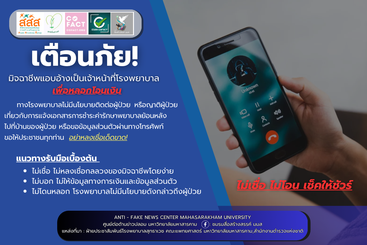 เตือนภัย! มิจฉาชีพแอบอ้างเป็นเจ้าหน้าที่โรงพยาบาล เพื่อหลอกโอนเงิน และส่งเอกสารยอดค้างชำระค่ารักษาพยาบาลไปที่บ้าน ขอให้ประชาชนทุกท่านโปรดอย่าหลงเชื่อเด็ดขาด